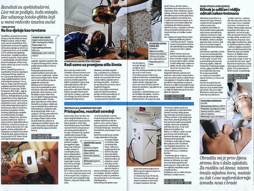 Teenlifting, revolucionarna metoda koju je razvila doktorica Sanja Malbaša Gošović, u biti se teško može nazvati kozmetičkom. Princip tretmana zvuči sasvim logično: elektrodama djeluje na mišiće lica i strujom jača tonus, ali ih ne bilda. S istim učinkom koji vježbanje ima na tijelo – kompletna mišićna struktura se podiže, a koža zateže. I, najuzbudIjivije, obrađeno lice je potpuno zategnuto, ali bez onog botoks-efekta koji u meni redovito izaziva sućut.