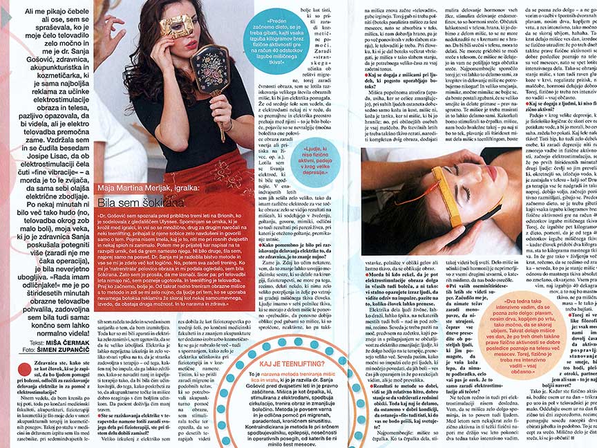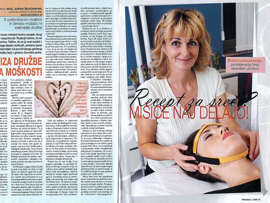 Sanja: To je trening, lifting, rehabilitacija, pomlajevanje, oblikovanje, elektrostimulacija mišic in stimulacija akupunkturnih točk, kar pomeni, da s fizikalno medicino v kozmetiki dosegamo rezultate rehabilitacije, terapije in preventive. Z aparatom za elektrostimulacijo, revitalizacijo mišic in stimulacijo akupunkturnih točk dosegamo izjemno dobre rezultate pri pomlajevanju obraza, zdravljenju migren, glavobolov, sinusitisa, bellove pareze, urinsko inkontinence, motenj pri povečani prostate, bolečinah v kolku … Tako so recimo na obrazu stimulirane vse mišice, rezultati pa so vidni že po prvem tretmaju, ker obraz deluje bolj sveže.